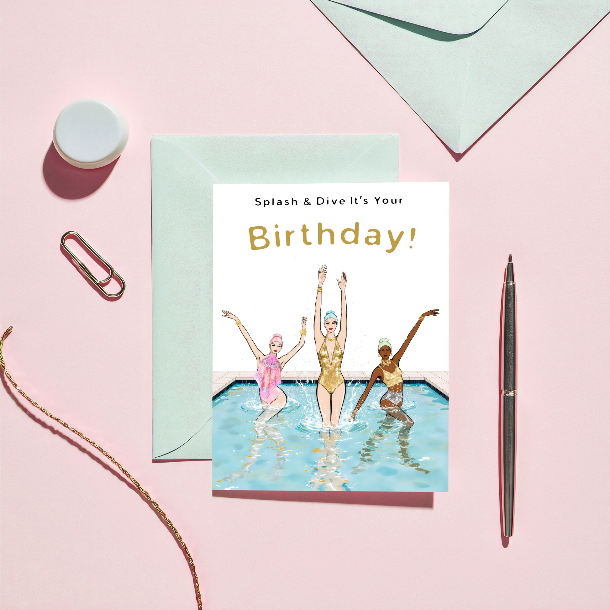 Splish Splash & Celebrate birthdays in style with this unique swimming inspired birthday card. Let's dive into the special day, perfect for anyone's birthday! Painted with bold colours and intricate detail, each card is printed and designed in the UK.